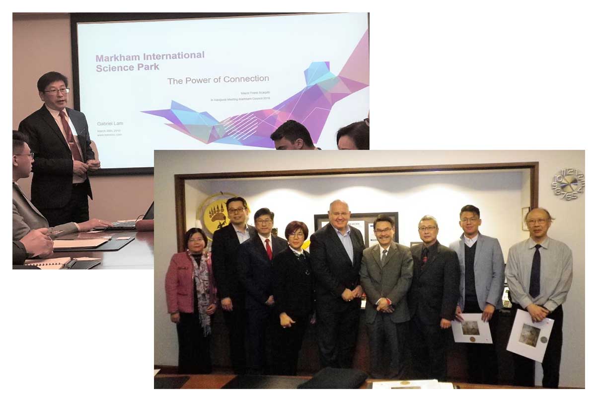 Meeting with Markham Mayor Frank Scarpitti and Counsillor Alan Ho in 2017 to discuss the Markham International Science Park